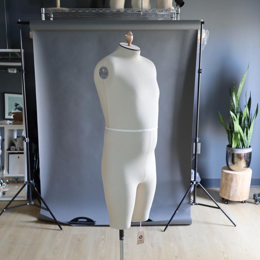 For those needing to fit garments through the crotch, we now offer a bifurcated half form with separated legs ending just above the knee. The adjustable cast-iron stand mounts through one thigh to allow fitting between the legs. Base model does not include arms.